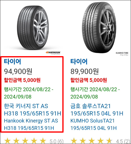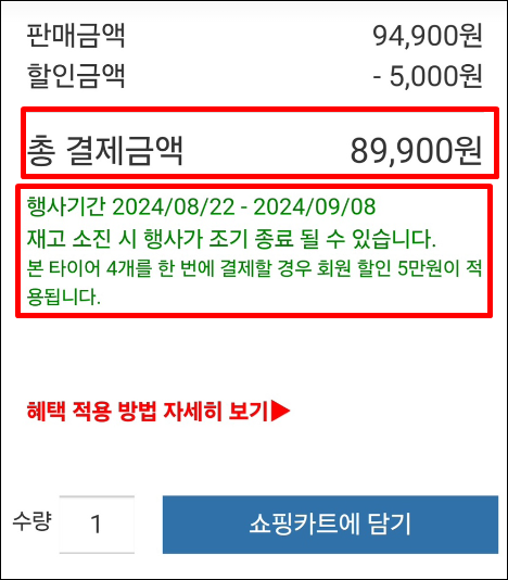 8) 타이어 1개당 5천원 할인 적용 받을 경우 코스트코 타이어 가격은 89,900원 입니다.