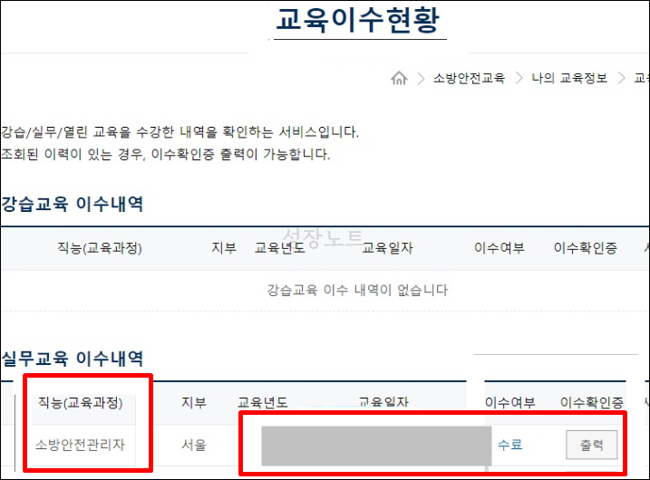 10) 교육이수현황에서 이수내역을 출력 하시려면 해당 페이지에서 확인 하시면 됩니다.