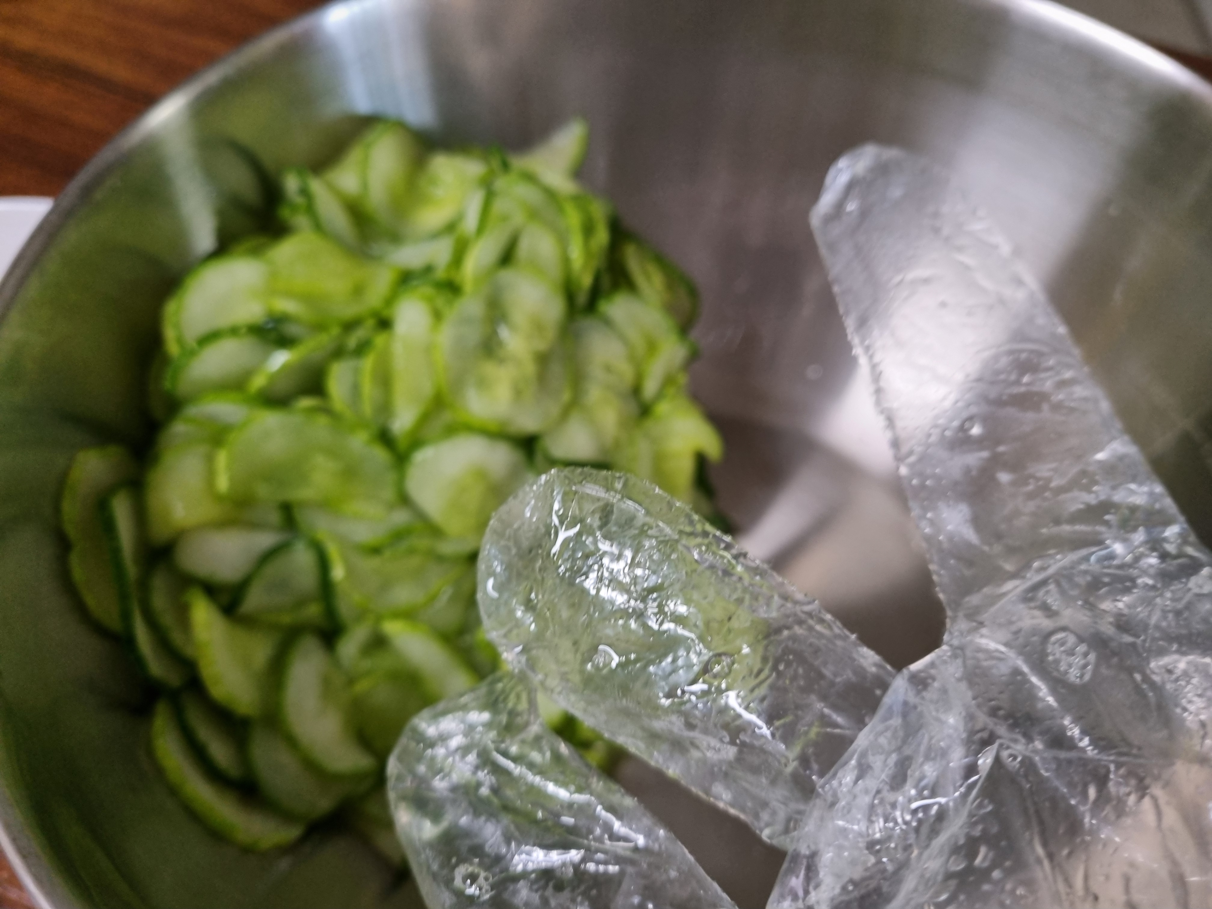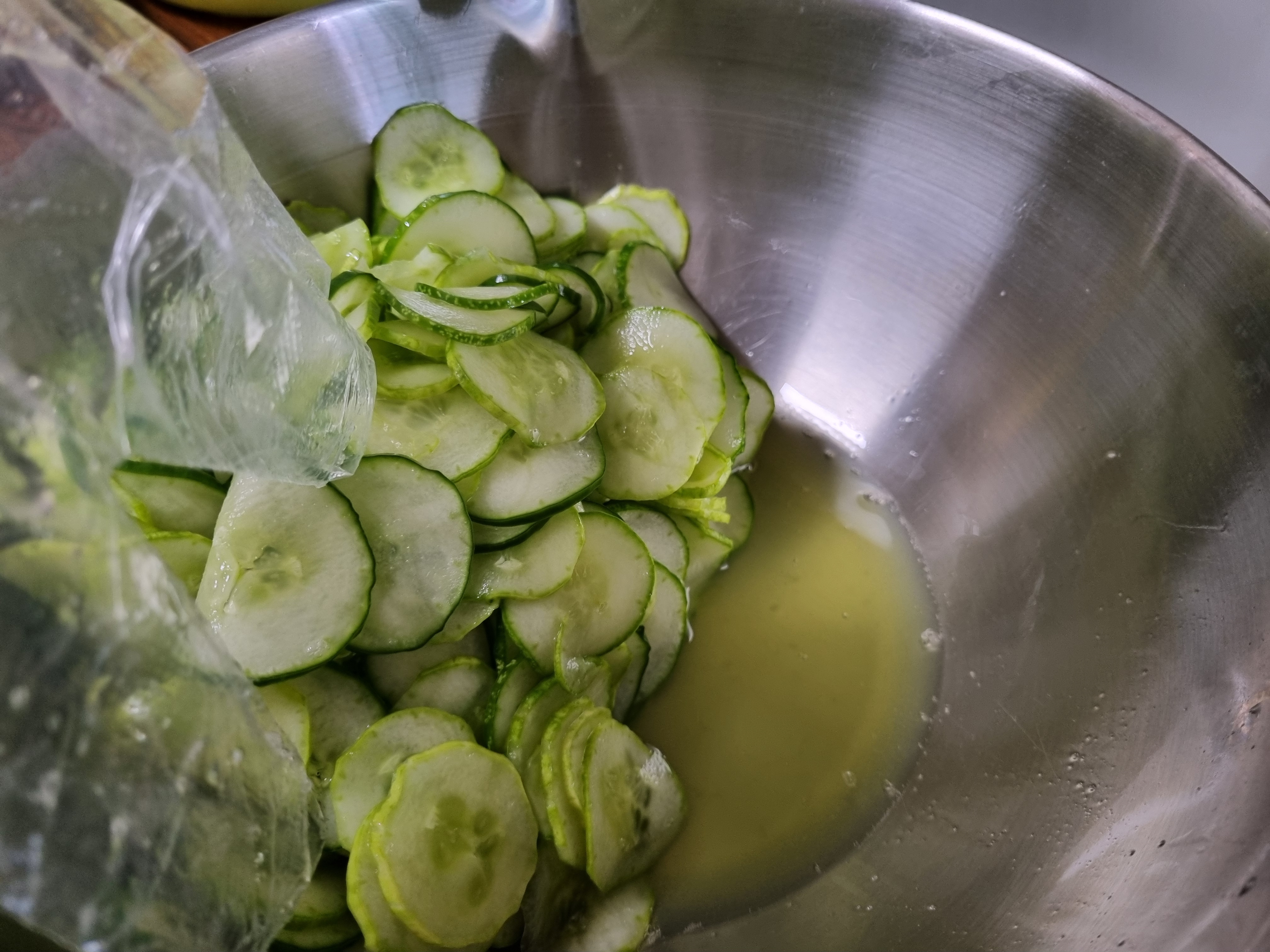 5) 시간이 지나면 오이에 남아 있는 물기를 짜 줍니다.