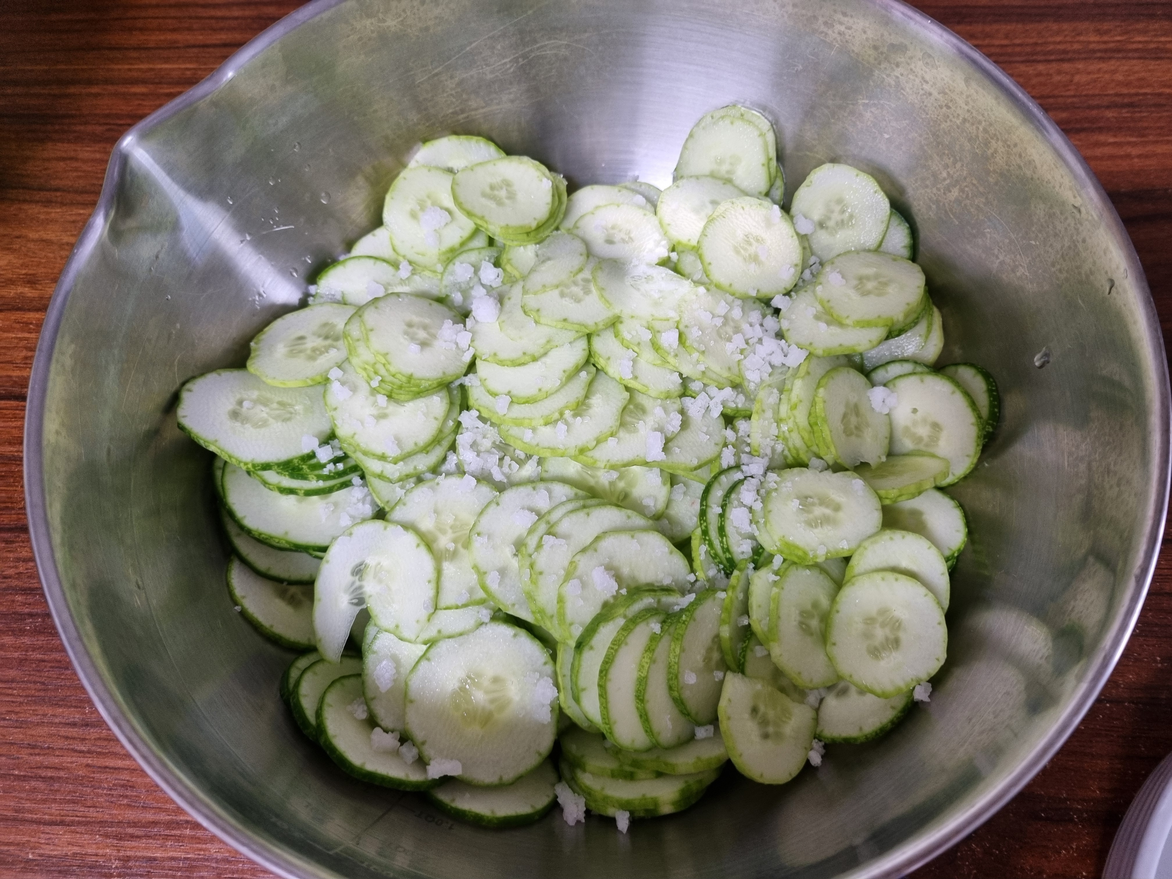 3) 오이 3개 기준으로 소금 1스푼 준비해서 골고루 뿌려 줍니다.